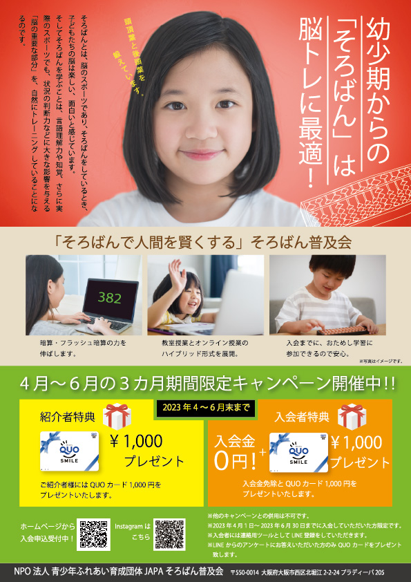 生徒募集キャンペーンのお知らせ 投稿日 2023-03-22 更新日 2023-12-25 著者 soroban カテゴリー お知らせ 生徒募集キャンペーンのお知らせ ◆2023.3.22 4月より期間限定の生徒募集キャンペーンが始まります。 キャンペーン期間中は入会金無料に加え、QUOカードをプレゼント致します。 まずは、お試し無料体験にご参加ください。 この記事を書いた人 soroban 記事一覧 ウェブサイト