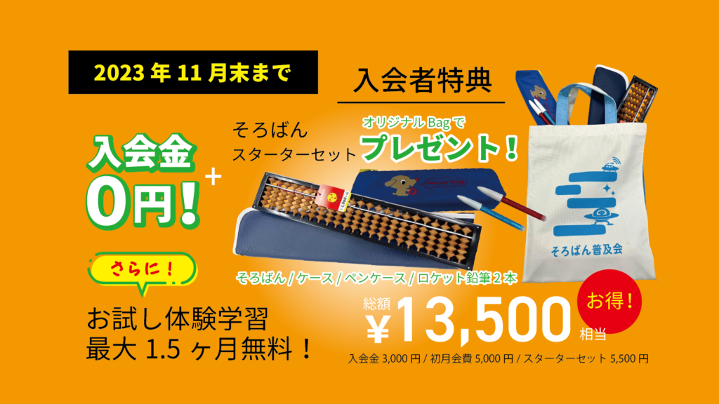 お試し学習は最大1.5カ月無料!!と、スペシャルな特典満載で実質13,500円もお得なキャンペーン。中学や高校受験を見据えて、そろばんを習う人が増えてきています。この機会にぜひ、お試し学習にご参加ください。